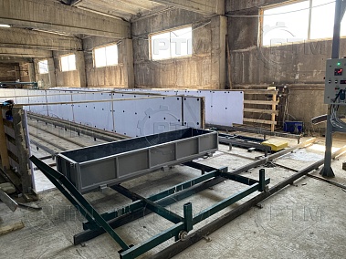 Транспортировка массива газобетона: Массив газобетона транспортируется по рельсовым путям с помощь электромеханического толкателя, из форм создается подобие поезда, одно основание толкает другое. Так происходит перемещение массива по заводу.