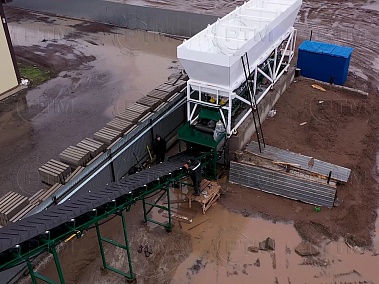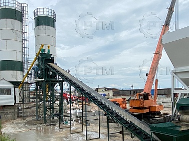 Ленточный конвейер имеет рамную конструкцию с фермами. В нижней и верхней части ленточного конвейера устанавливаются барабаны с футеровкой, ведущий барабан приводится в движение при помощи червячного мотор-редуктора. Конвейерная лента шевронная закрытого типа. В нижней части конвейера имеется приемный бункер, конвейер имеет от бортовку, это необходимо чтобы инертные материалы не просыпались с ленточного конвейера при транспортировки инертных материалов в бетоносмеситель. Все конвейерные ролики оцинкованные.