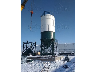 Силос цемента предназначен для хранения цемента на площадке. Силос принимает цемент по трубе закачки от цементовоза, сохраняет его от внешних воздействий. Далее цемент подается при помощи шнекового конвейера на блок дозаторов. На блоке дозаторов взвешивается и попадает в производственный цикл бетона на бетонном заводе.