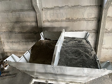 2. После набора нужного количества материалов инертные попадают в скиповый бак, далее скиповый бак поднимается и высыпает материалы в бетоносмеситель.